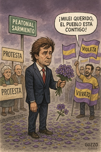 Javier Milei viajó a Mendoza en busca de un baño de multitudes… y terminó chapoteando entre violetas marchitas y gases lacrimógenos simbólicos. El presidente soñaba con caminar triunfal por la Peatonal Sarmiento junto a Luis Petri y el gobernador Alfredo Cornejo, pero la realidad —esa señora implacable— lo despertó antes del primer paso.