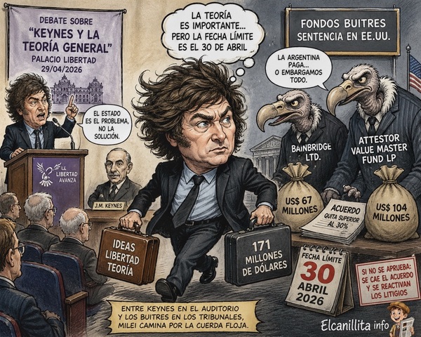 Mientras el presidente Javier Milei se sienta a debatir sobre la vigencia de la Teoría General del Empleo, el Interés y el Dinero en el Palacio Libertad, su administración acelera en paralelo una negociación mucho más terrenal: el pago de 171 millones de dólares a fondos buitres con sentencia firme contra la Argentina. Una escena que mezcla filosofía económica con pragmatismo judicial.